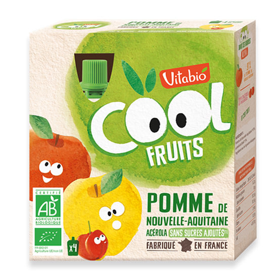 Βιολογικό επιδόρπιο φρούτων με μήλα και κεράσια ασερόλα. Eπιδόρπιο που ισοδυναμεί με μια μερίδα φρούτων ημερησίως. Ιδανικό σνακ για οποιαδήποτε στιγμή της ημέρας. Χωρίς χρωστικές ουσίες, συντηρητικά, προσθήκη ζάχαρης. Είναι πιστοποιημένο από την Ecocert και το γαλλικό Υπουργείο Γεωργίας και Αλιείας.